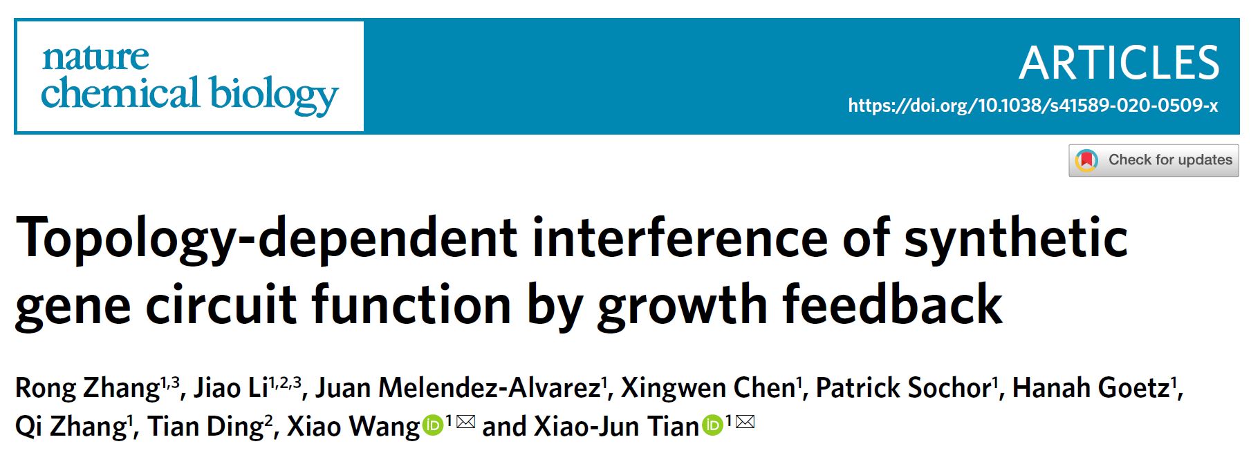 - Zhang, R., Li J., Melendez-Alvarez, J., Chen, X., Sochor, P., Zhang, Q., Goetz H, Ding, T., Wang, X., Tian, X.-J., Topology-Dependent Interference of Synthetic Gene Circuits by Growth Feedback. Nat.Chem.Biol. 2020. (Accepted)